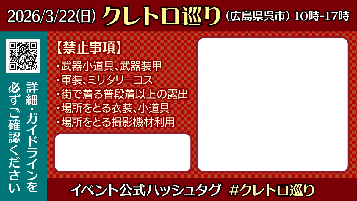 本イベントにつきましては更衣室を使わない参加も可能です。家やホテルから衣装を着用したまま自家用車やタクシーで来場していただくか、エリア内の有料駐車場にとめた自家用車の中で着替えてください。イベントエリア外から公共交通や自転車・徒歩等でお越しの際は衣装の上からコートや帽子等を着用しコスプレだとわからないようにし、周囲に威圧感や不審感を与えないようにお願いいたします。公共トイレ・路駐車内など迷惑になる場所での着替えや仕上げは禁止とします。【お願い】このイベントは更衣室を使わないコスプレ参加がOKとなっておりますが、他のイベント会場・他のイベンター様のイベントではそうでないこともあります。参加概要や規約はイベントごとに毎回ご確認ください。 - 主催:呉海軍グルメ研究会( @kurekaigun_gurume)