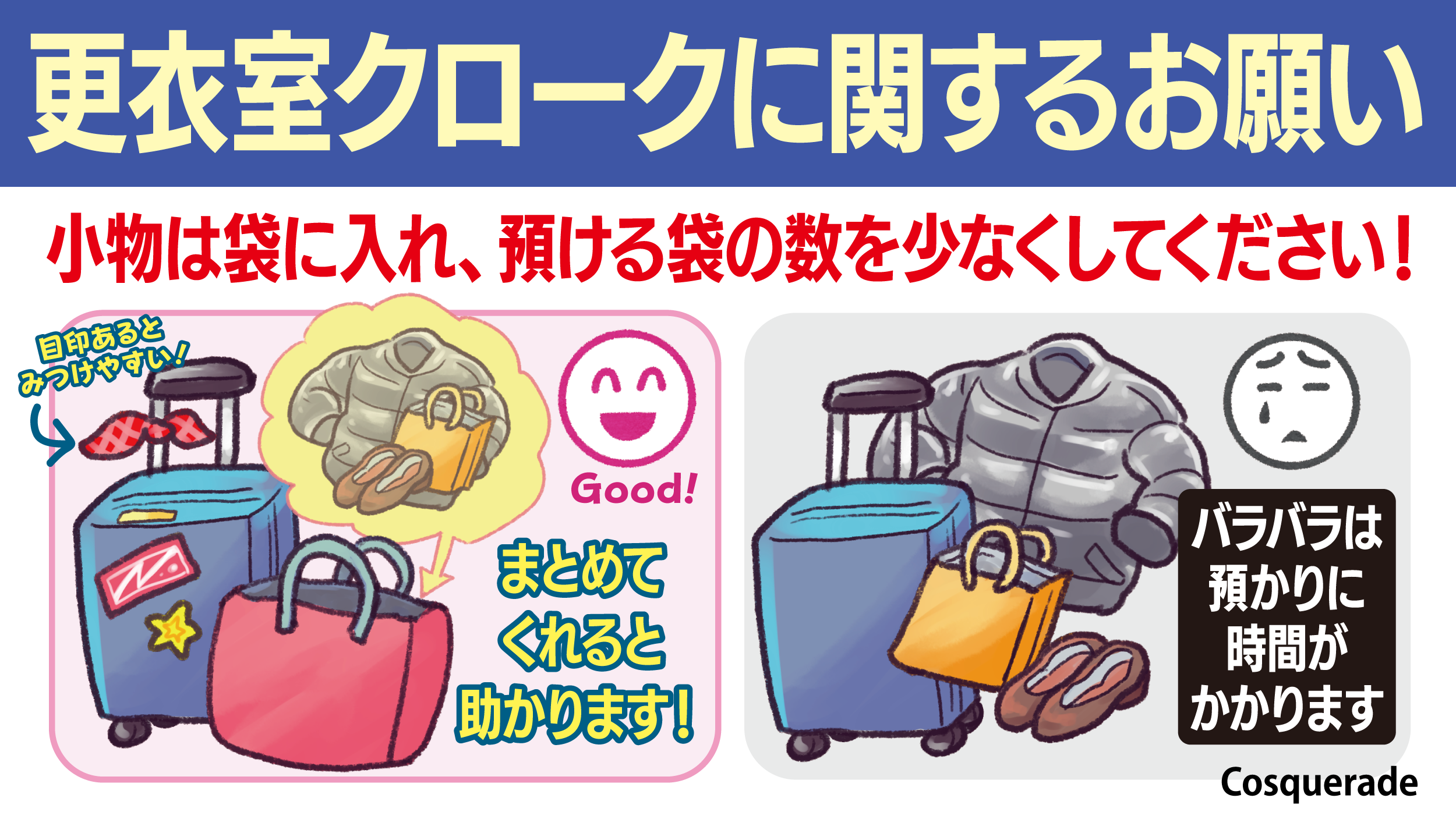 【荷物について】荷物にチケットの上半分を取り付け、更衣室内の邪魔にならない場所に置いて出てください。その際に貴重品は更衣室内に残さないようにしてください。チケットの下半分はイベント終了まで持ち歩いてください。