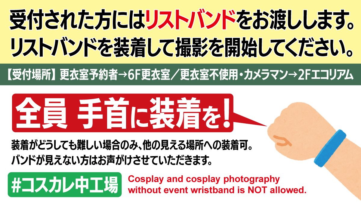●着替えたあと、6F廊下にいるスタッフより衣装のチェックをうけてリストバンドを受け取ってください。リストバンドは必ず手首につけてください。